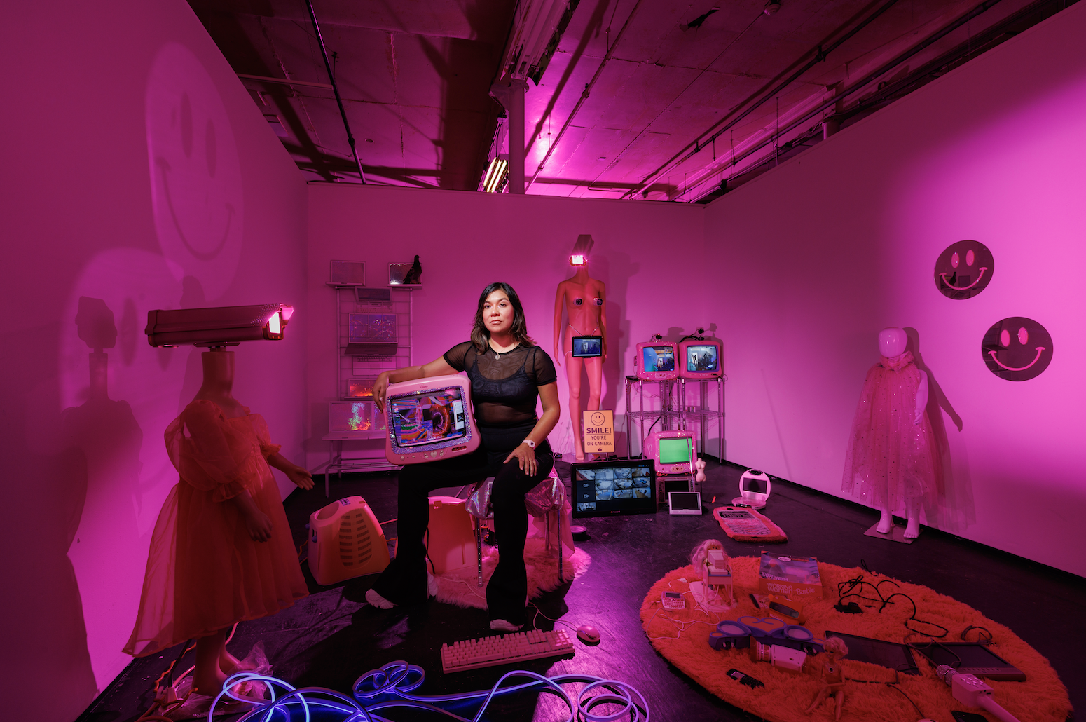 Her installations, produced with e-waste, surveillance cameras, mannequins, glitter, gemstones, LEDs, and girly aesthetics, evoke a sense of warmth and nostalgia while simultaneously challenging viewers to consider the environmental toll of technology. Larios’ work invites audiences to ponder personal data and critically examine our digital lives, exploring the ramifications of how the intimate details of our lives are exploited by corporations and governments.