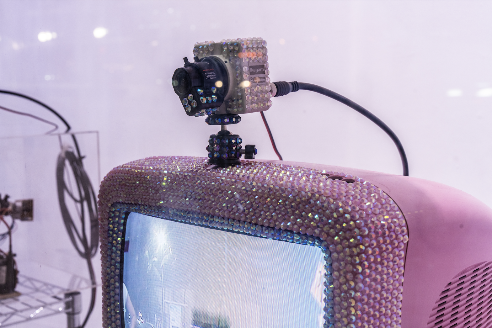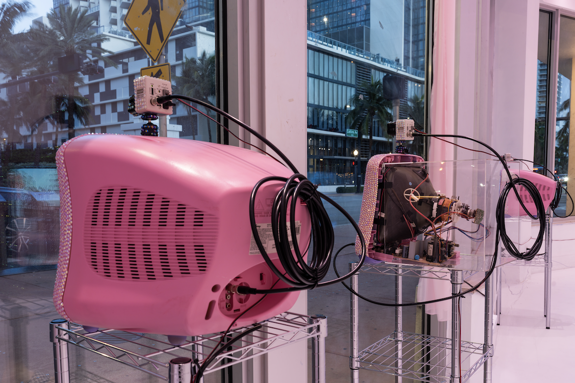 Since I started at Bakehouse, I’ve been working a lot more with this juxtaposition of surveillance and “girly” nostalgia as two converging themes. I’ve been bedazzling everything— flat TVs, CRT TVs, laptops, and surveillance cameras of all kinds. In exploring these themes, I’ve moved from smaller pieces to bigger installations, those of which have been shown at the National Museum of Guatemalan Art and the Chroma Art Film Festival.