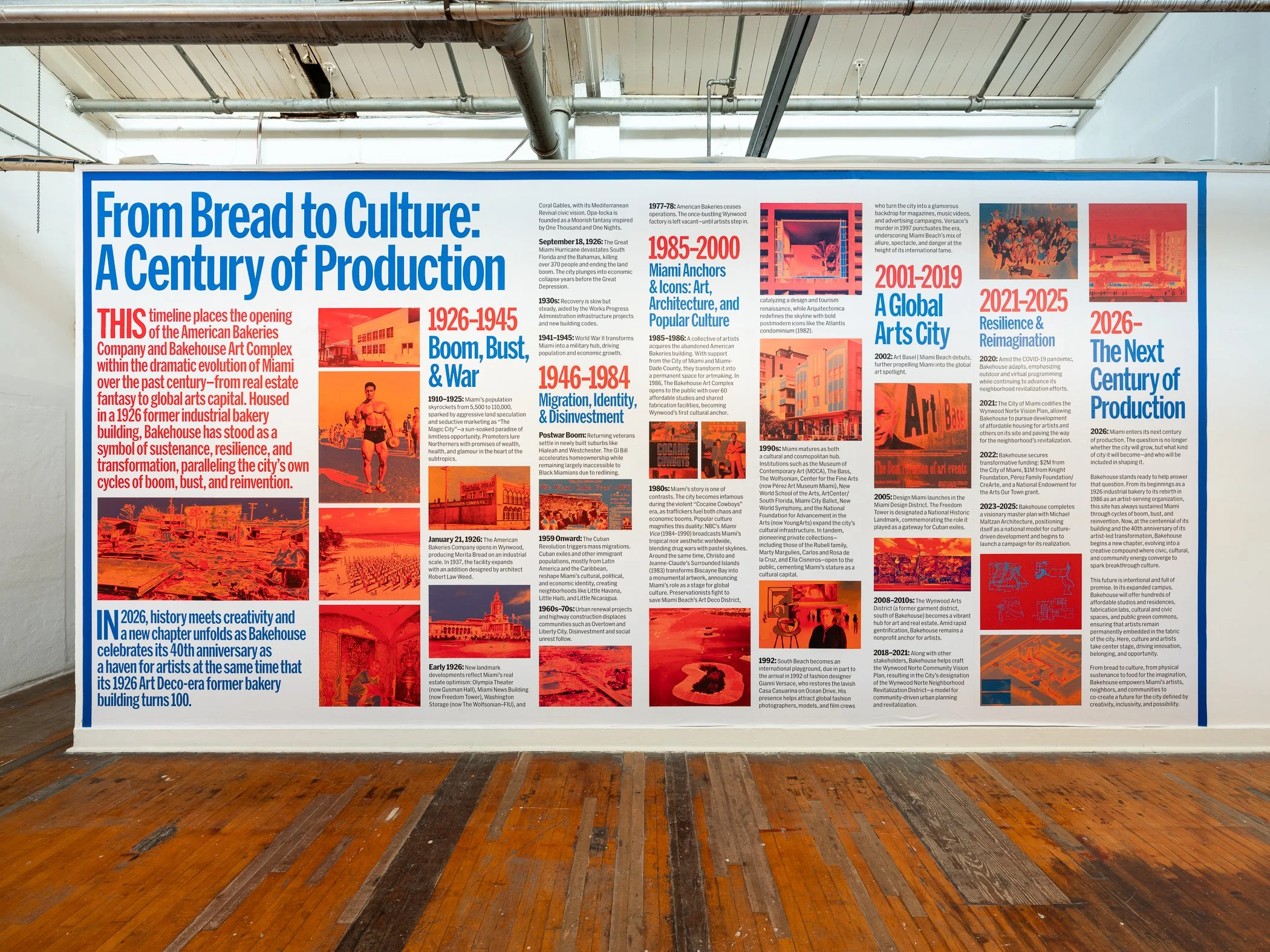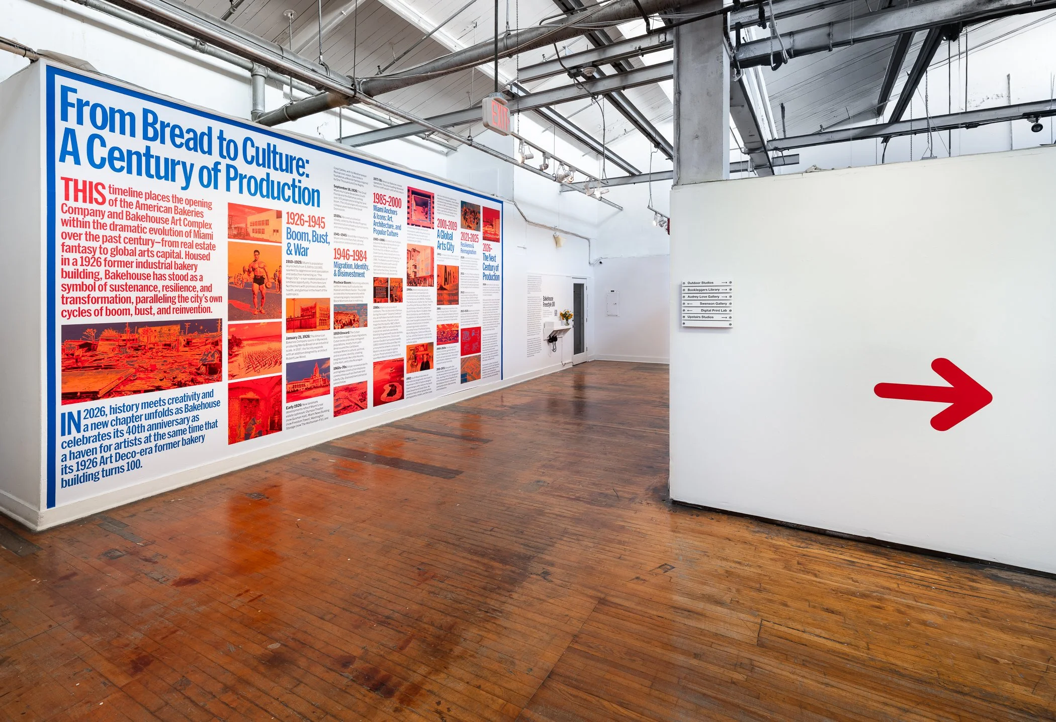 In early 1986, Bakehouse opened its doors to the public in an abandoned Art Deco–era industrial bakery—the American Bakeries Company. As the organization celebrates its fortieth birthday and the centennial of its iconic building, we present this multi-faceted installation. To situate Bakehouse within the broader arc of Miami’s social, cultural, and economic development, we also share a century-long timeline, quotes about the bakery and Bakehouse drawn from public sources, and a commissioned audio work by Archival Feedback evoking the sounds of the past one hundred years. We invite you to join us in exploring decades of legacy, community, and vision.